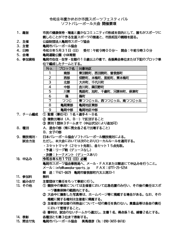 | 対 象 | ▸ 亀岡市在住・在学・在勤の16歳以上による、各振興会単位 ▸ ブロック単位で編成したチーム。 |